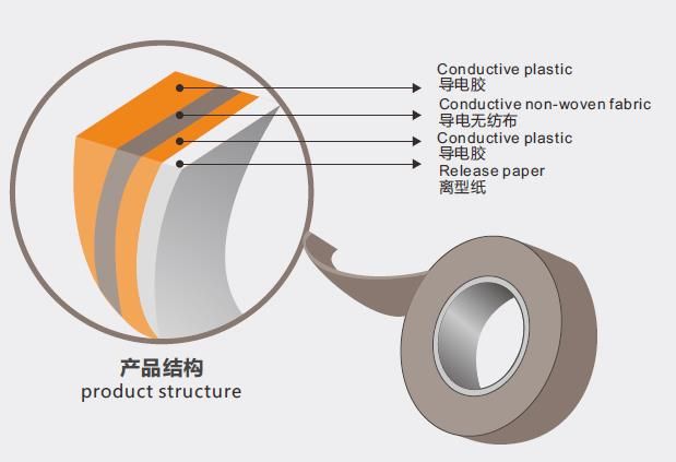 纤维无纺布电镀铜、镍后通过涂布工艺涂抹导电压敏胶加工制成。